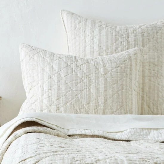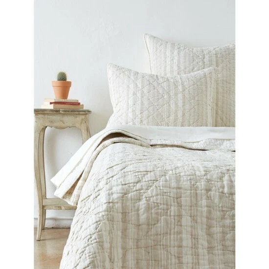 With an understated striped pattern in a soft beige and off-white, this beautiful Allen quilt blends beautifully with any decor. The linen and cotton fabric provides soft warmth. This quilt features a striped pattern and is available in king, queen or twin.
