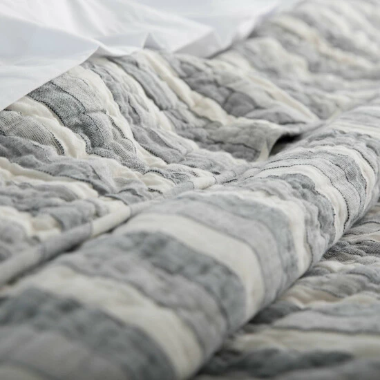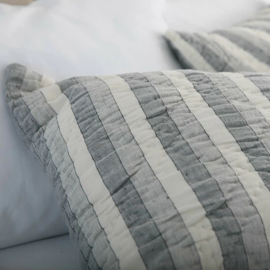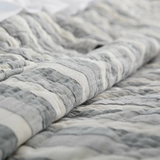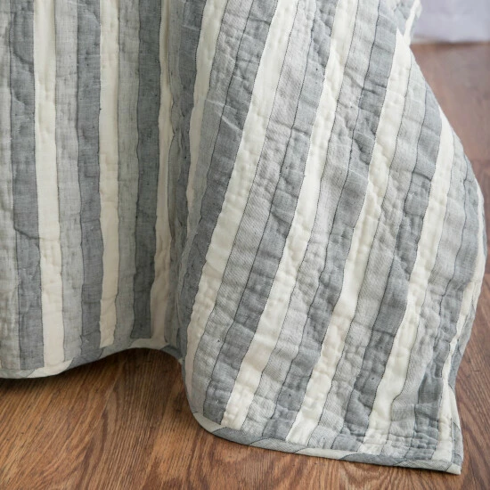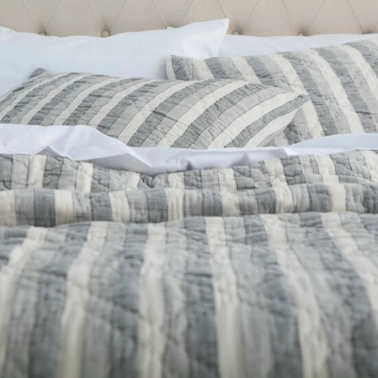 Yard dyed Stripe quilt in soft grey, white and ivory tone. Create an understated and inviting environment in your restful retreat with this quilt set, complete with one quilt and two matching shams (or just one for the twin size) Available in 3 different sizes.