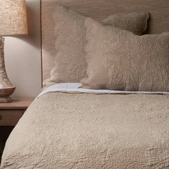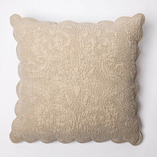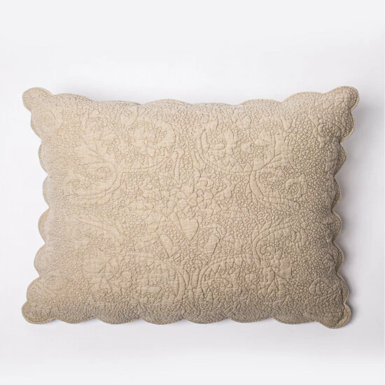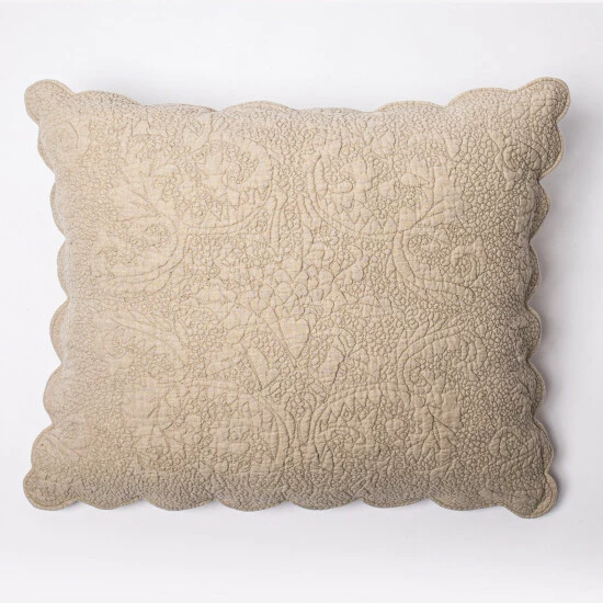 The intricate quilting detail on the Brady quilt guided by hand to achieve the delicate raised scroll motif. 100% natural linen on the front and back and is finished with a scalloped edge. Β