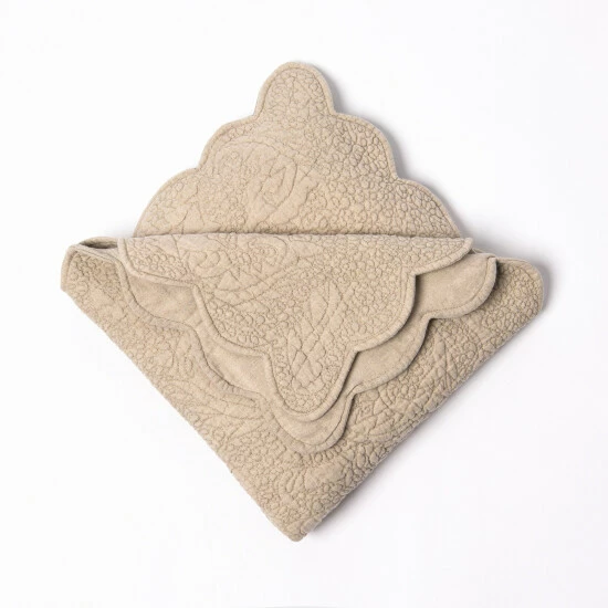A specialty from Marseilles, this very refined needlework was richly quilted with various intricate motifs, some of them stuffed with additional batting called βBoutisβ to make them stand out in relief. Boutis is a Provencal word meaning βstuffingβ . A special needle, also called Boutis and made out of boxwood, was necessary to delicately stuff the work. Available in all Linen Quilt with french trupunto quilting and scalloped edges. Every wash makes this quilt softer.Β