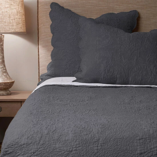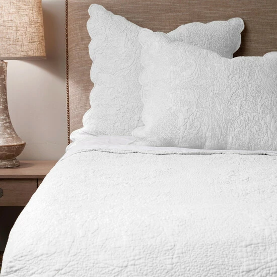 100% Linen Quilt with french trapunto quilting, and scalloped edges for a refined look. Β This quilt is machine washable, and wash makes this quilt softer. Β Available in White, and Steel Blue