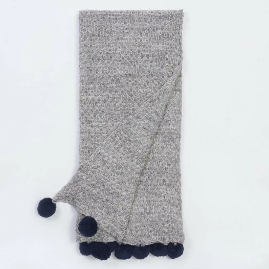Our Caley throw features a subtle circular geometric pattern on one side and an even pattern on the other side. The edges are adorned with deep blue pom poms that are quite soft to the touch.Β