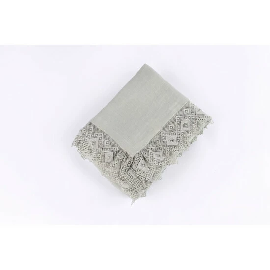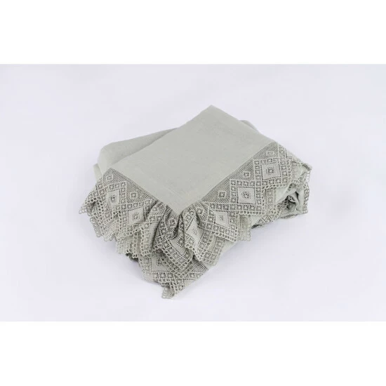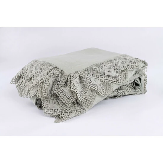 Points of delicate lace surround this linen duvet cover for a fresh, vintage vibe. Three rows of hem stitch run along the foot of the bed and side of each sham for additional subtle detail.
