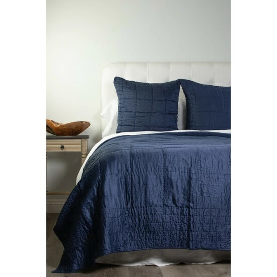 Sleek, yet slightly modern block quilted Caper Indigo and the structured mercerized cotton coverlet. The quilt is constructed of silky viscose backed with soft cotton voile and hand quilted in a gridded block pattern with a quarter scale border. This collection has an air of modern elegance when dressed up and can easily lend itself to a more bohemian flair depending on application. The set includes 2 Euro Shams.