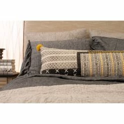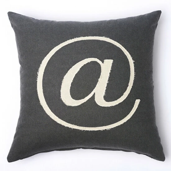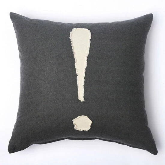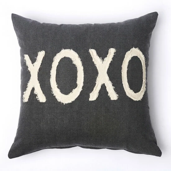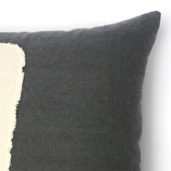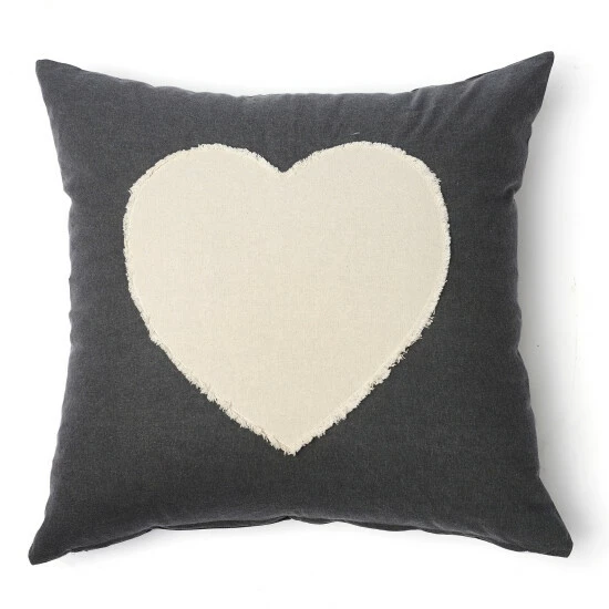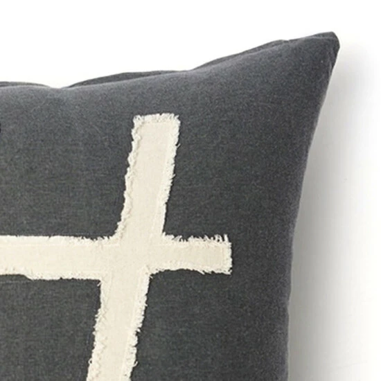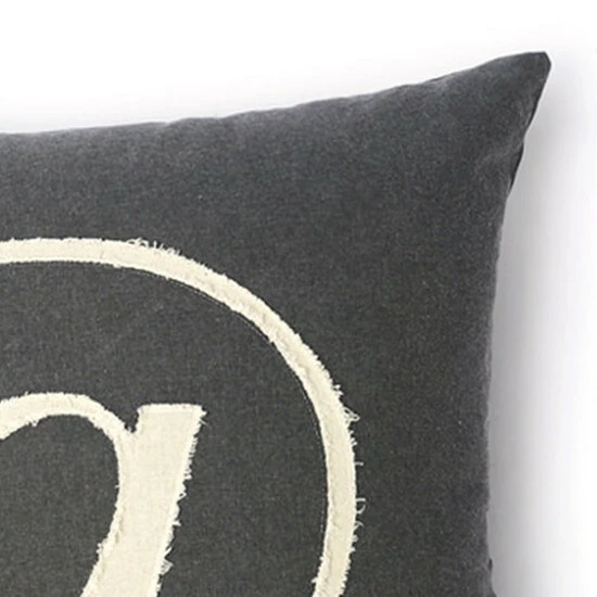 These grey canvas pillows make a fun statement with natural canvas appliques depicting various symbols.