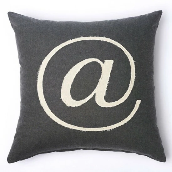 Β These grey canvas pillows make a fun statement with natural canvas appliques depicting various symbols. Β