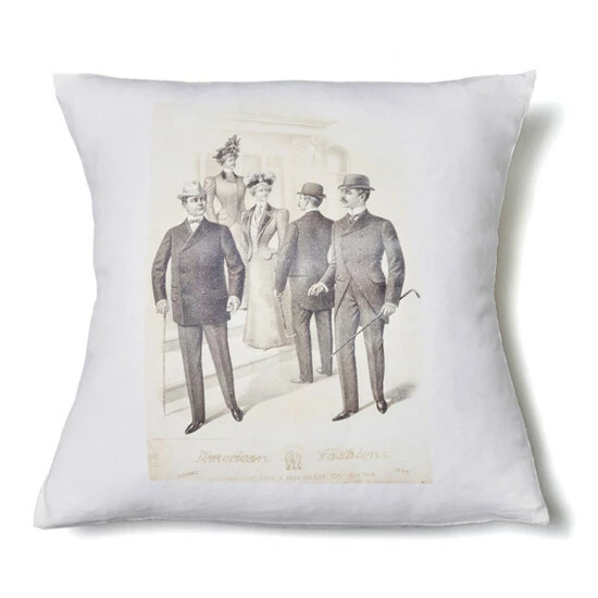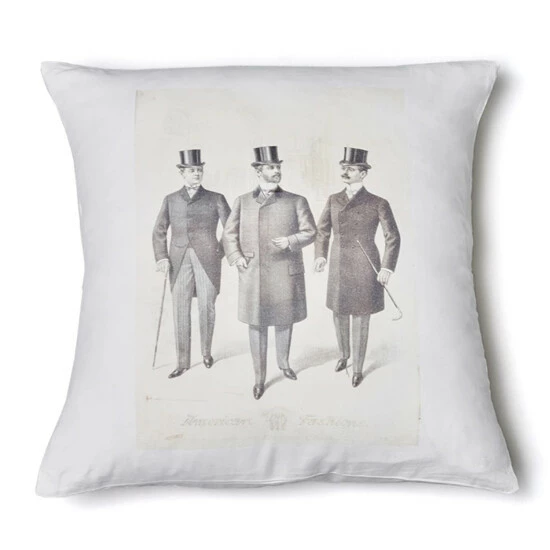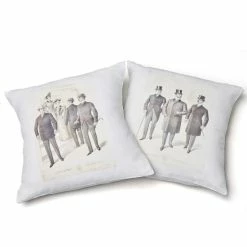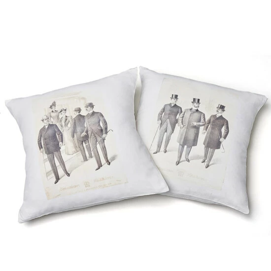 This set of 2 white cotton throw pillows depict dapper gentlemen from yesteryear, a unique accent for any room. Β The removable covers are machine washable, polyester inserts are included with your order.