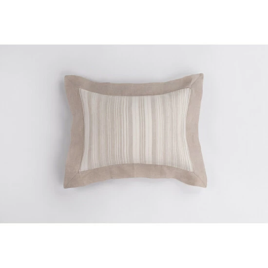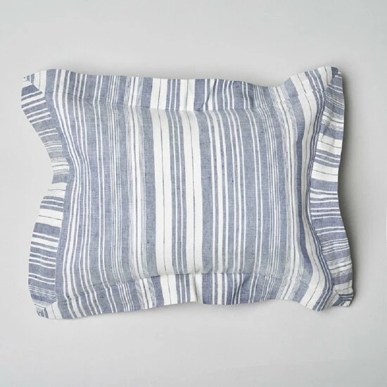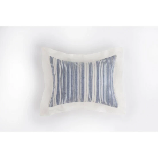 Fine linen and cotton are yarn dyed and woven together to create this complex unbalanced stripe. This versatile stripe can be used in settings from Coastal to Cottage and from Romantic to Masculine. This pillow is best suited for toddlers or small children. Adults and teens can still make good use of this pillow. Size: 12″ x 16″ and made with 55% linen and 45% cotton..