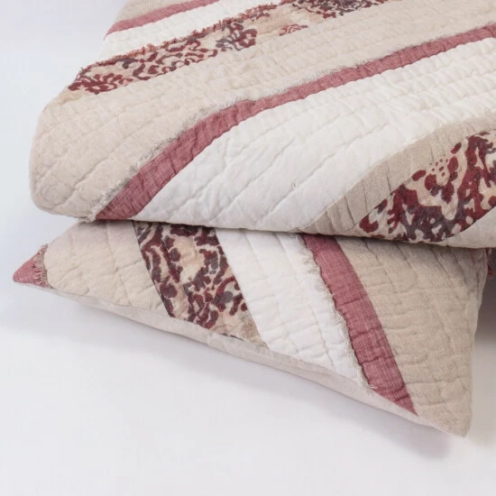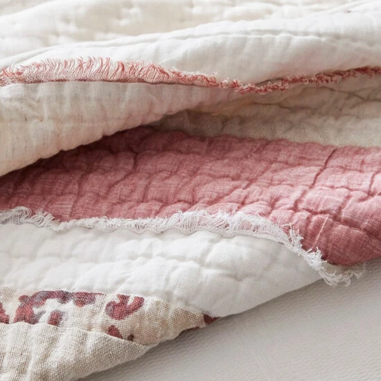 Our Dwayne Quilt is a perfect modern patchwork. Diagonal stripe patches, with eyelash edges, blend together in shades of Pomegranate, Natural, and Ivory.