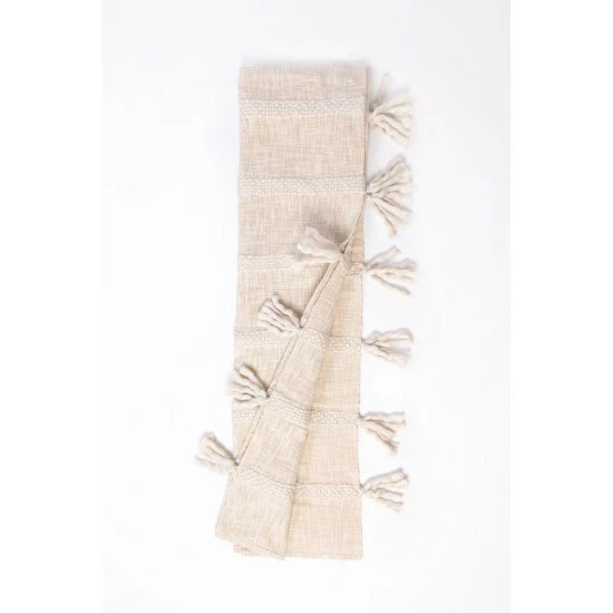 Subtle, yet statement, this throw is weaves slubby cotton in the warp and weft creating a light weight texture all over, with plush bulky yarn running horizontally creating a textural stripe. Finished with hand tied tassels on each either sides.Β