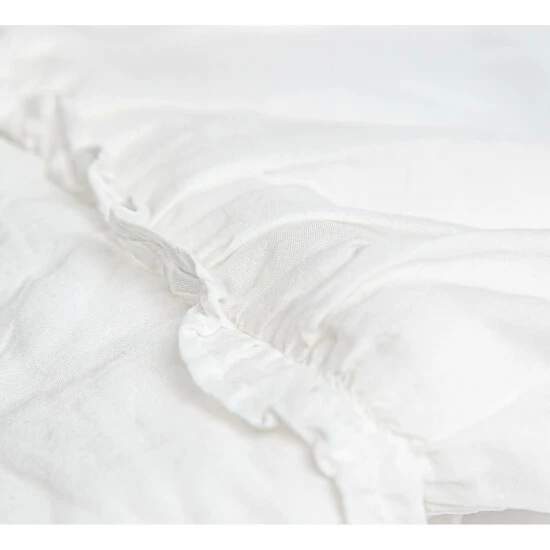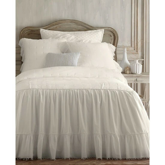 Call It a skirted coverlet or a bedspread but our Fonia is absolutely gorgeous with long light gathered cotton voile fabric draped all three sides. The top part has light fill and is quilted. Piping between the top and side drapes gives it an elegant and classy look. The drapes on the sides have 30 inch drop so works with your high beds or drapes beautifully on a regular height bed. The Fonia Bedspread has a lightly padded tacked top surrounded by structured piping with a 30β long gathered waterfall skirt. This ethereal bedspread is finished with a hand frayed eyelash edge.Β
