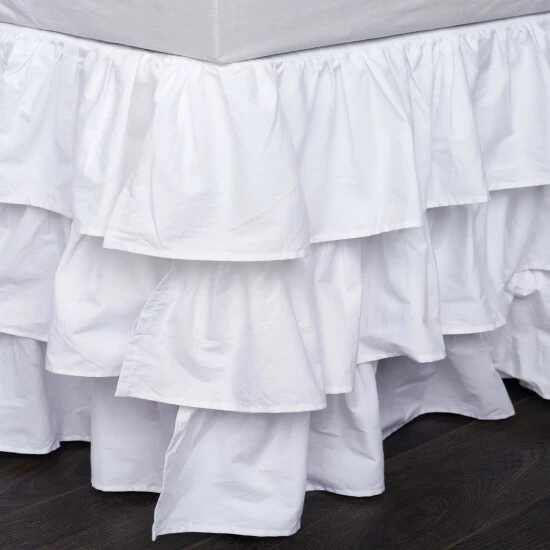 Featuring three tiers of soft, ruffled fabric, this beautiful French ruffle bedskirt transforms your bed with ethereal, romantic style. Made of 100-percent cotton, the bedskirt is machine washable for convenience, and the generous 18-inch drop easily hides box springs, mattresses, or under-bed storage.