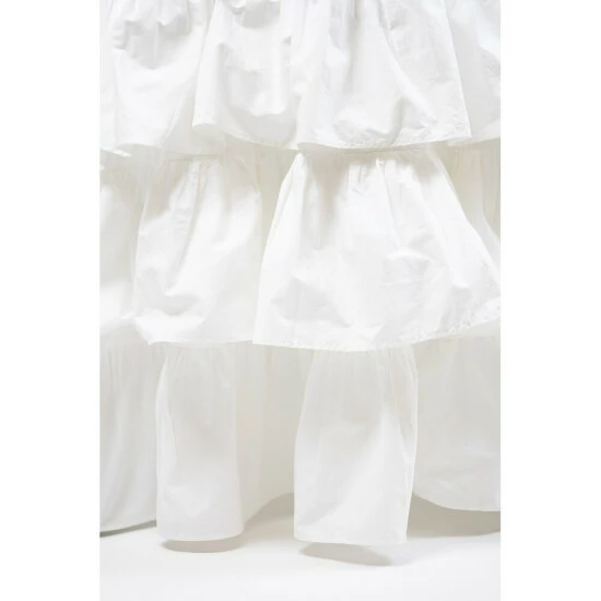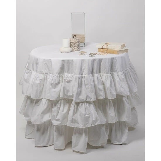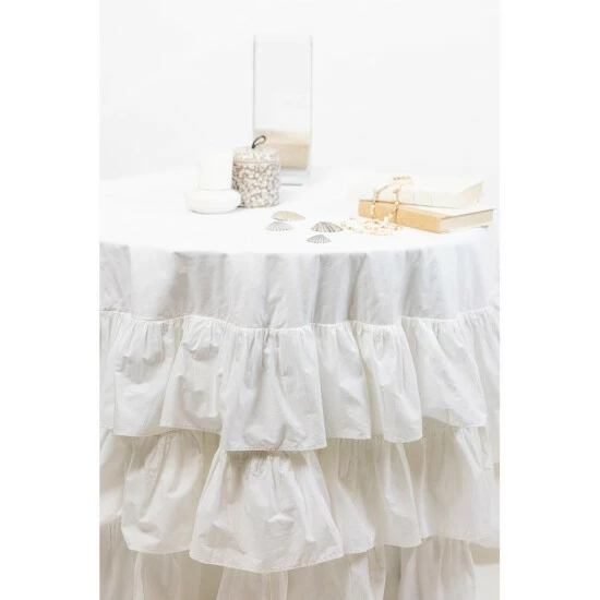 This tablecloth features elegant ruffles which provide a flowing visual to the table. It’s solid color keeps the focus on a simple note to accentuate the setting. Made from cotton, this tablecloth is easy to maintain and is machine washable.