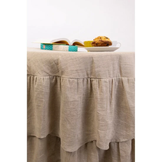 This tablecloth features elegant ruffles which provide a flowing visual to the table. It’s solid color keeps the focus on a simple note to accentuate the setting. Made from linen means that this tablecloth is not only elegant but also durable and long lasting.