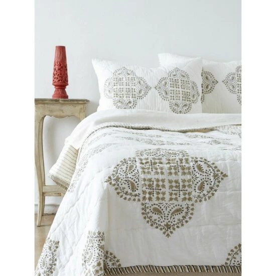 Capture a soft, Mediterranean elegance with the Gabriella quilt set. Available in a twin or queen size, this cotton medallion printed quilt set balances peaceful white with vibrant and serene olive hues. Features: