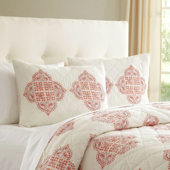 Capture a soft, Mediterranean elegance with the Gabriella quilt set. Available in a queen or king size, this cotton medallion printed quilt set balances peaceful white with vibrant and playful peach hues.