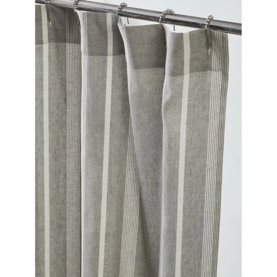 The gray and natural stripe pattern gives a feeling of elegant simplicity to this machine washable shower curtain. It’s subtle colors can complement most bathroom designs and truly show it’s versatility. Does not include hooks or liner. Shower curtain size: 72″ x 72″.