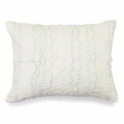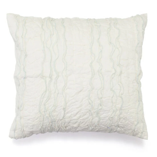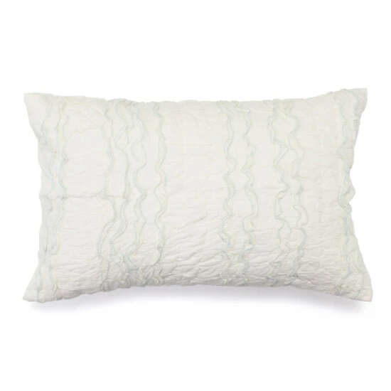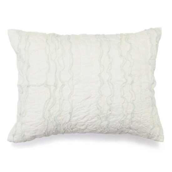 A charming white cotton ruffled sham, with teal accent stitching along the ruffle edges. Insert not included.