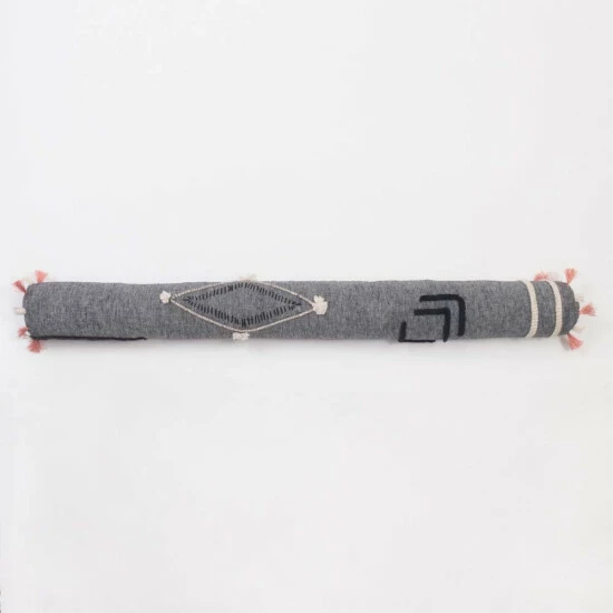 This unique accent pillow packs a punch of texture and detail in it’s petite size. With a chambray linen ground, the applique pieces in Asphalt and Ivory are offset by a gentle pop of color in the tassels at each end.
