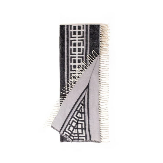 Β This soft felted throw is reversible from rich charcoal to soft grey, banded with a classic geometric design at each end and finished with tassels.Β
