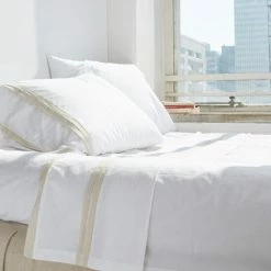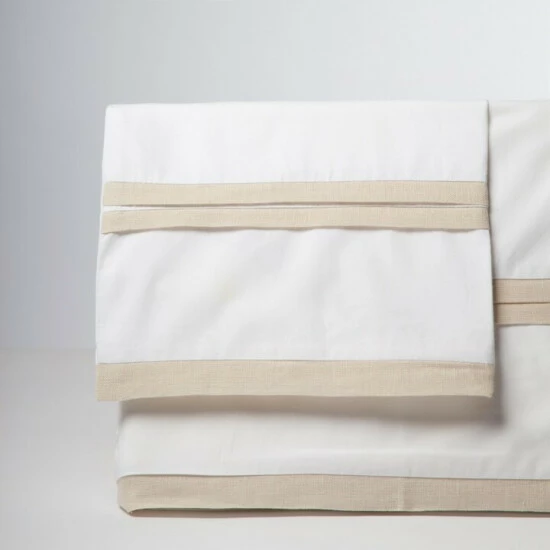 Crisp white cotton percale sheeting trimmed with a trio of linen flanges for a clean finish.