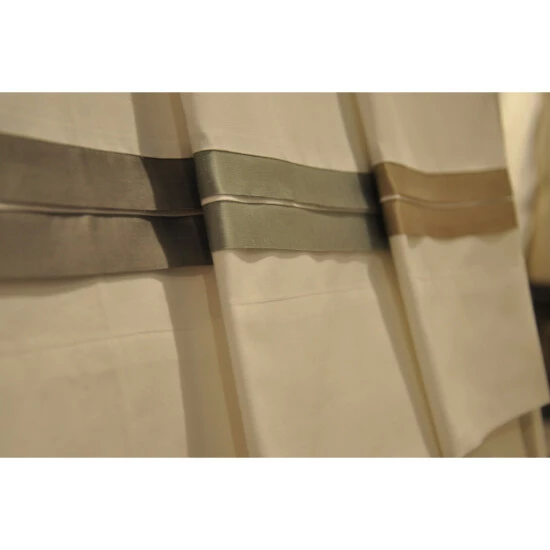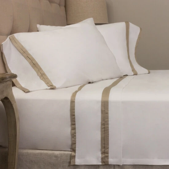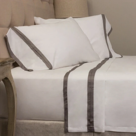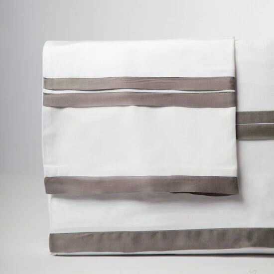 The banding on the White flat sheet and pillowcases are grey or brown Modal fabric. Base is 100% Cotton Percale, Flange is Cotton/Linen Blend. This is for a set of 2 pillowcases.Care Instructions: Machine Wash Cold, Gentle Cycle. Do not use Bleach. Tumble Dry Low or Line/Flat Dry. Do not Dry Clean.We make every effort to display color accurately in our images. However, digital screens and monitors may display color differently. We cannot be responsible for color variations between our product and your screen.