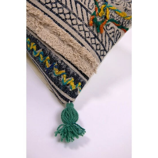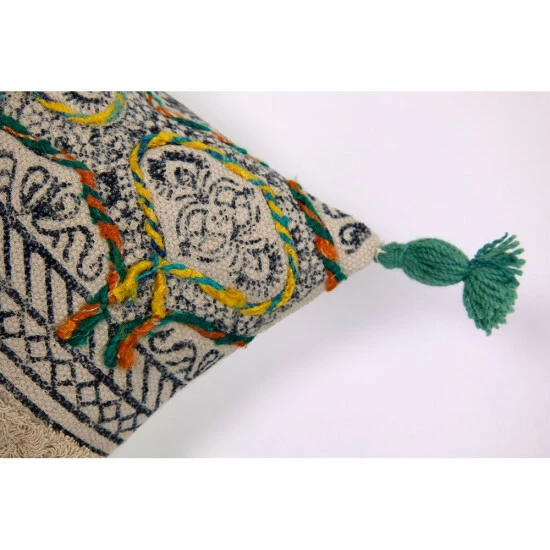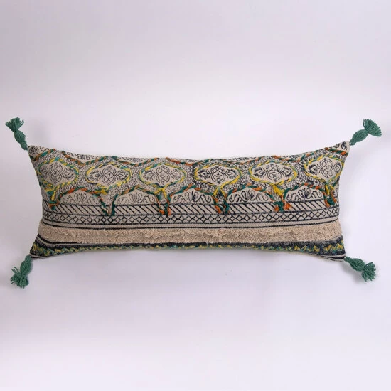 Our Lae extra long bolster pillow is handmade and embroidered with a variety of patterns and colors. The corners are topped with green tassels to provide a flowing edge. The pillow has a zipper enclosure on the back and is machine washable.