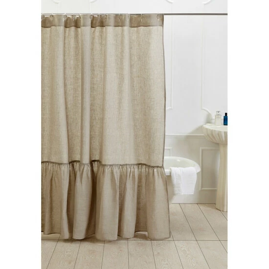Β The Laina shower curtain is a natural linen curtain fabric with a small, petite ruffle on the bottom. These curtains will make any room in your home feel rustic.