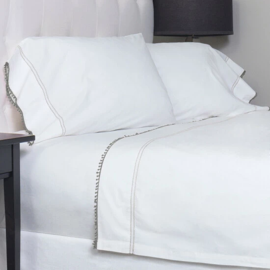 Β Crisp cotton percale finished with a contrasting hem stitch and delicate tatted trim.