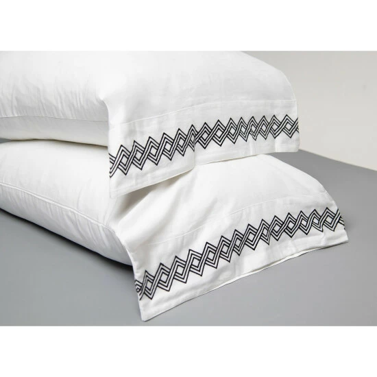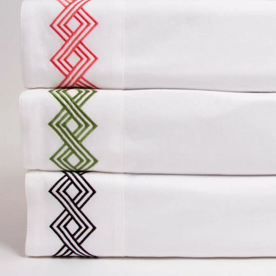 A modern twist on the classic chain, embroidered on a crisp 400 thread count cotton sateen sheeting cloth. The embroidery motif runs along the top hem of the flat sheet and edge of each pillow case.Β