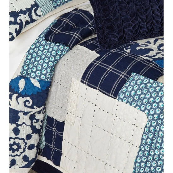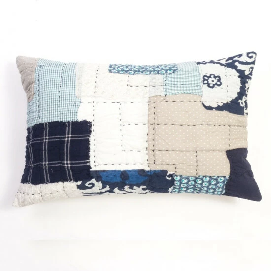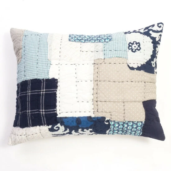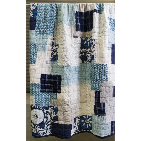 Maycie is inspired by traditional utilitarian patchwork quilts in which instead of piecing squares, patches are layered upon one another in an improvisational way resulting in a raw and dynamic effect. Then the piece is hand quilted in an elongated kantha style stitch in an irregular pattern. This quilt is finished with a raw edged binding.Β