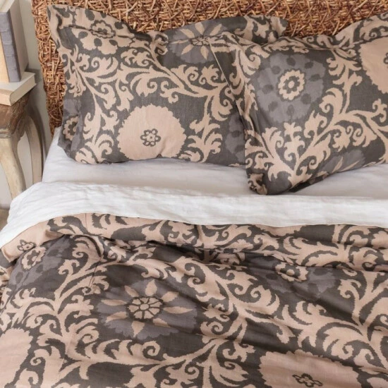 Mirabelle is inspired by traditional Suzanni patterns, printed in rich hues of Ash Grey, Charcoal and Taupe. The shams sport a 2” wide ruffled flange. Linen/Cotton blend front reverses to cotton flax for softness.