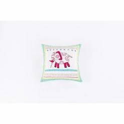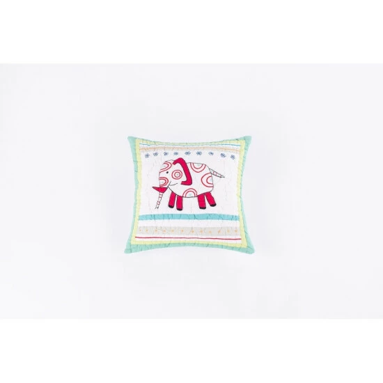 These throw pillows features elephants that differ slightly. Both have the same color scheme or red, white and green as well as the green border and striping at the bottom while floral patterns are at the top.