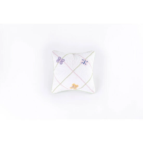 This pillow features 3 butterflies that are different colors embroidered on the pillow cover. The cover also features pink and green embroidery on it with a white base to provide a simple background.Β
