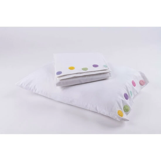 This sheet set features colorful and vibrant large polka dots that are appliqued to the pillowcase and sheet.