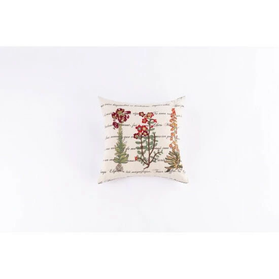 This pillow features three different flowers and plants while phrases in French are present.Material: 100% CottonSize: 16 x 16 inchesRemovable cover and includes a polyester insertCare Instructions: Machine Wash Cold, No Bleach. Gentle Cycle. Tumble Dry Low or Flat or Line Dry. Do not Dry Clean