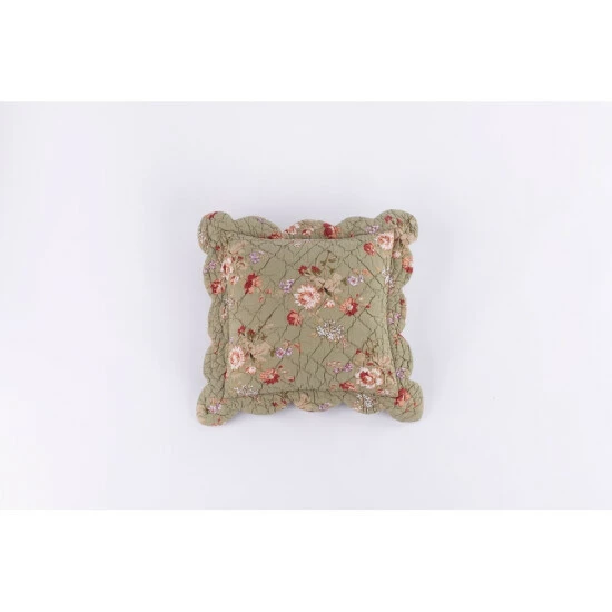 This throw pillow features elegant scalloped edges along with floral patterns throughout the cover. Material: 100% CottonSize: 16 x 16 inchesRemovable cover and includes a polyester insertCare Instructions: Machine Wash Cold, No Bleach. Gentle Cycle. Tumble Dry Low or Flat or Line Dry. Do not Dry Clean