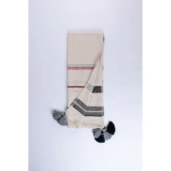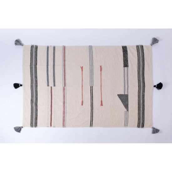 Fine cotton fibers are interwoven with a plush space dyed boucle yarn for soft hand feel. This has 6 tassels; one in each corner (grey) as well as 2 (black) in the middle. Fabric Content:100% CottonCare Instructions: Machine Wash Cold, Gentle Cycle. Do not use Bleach. Tumble Dry Low or Line/Flat Dry.