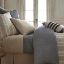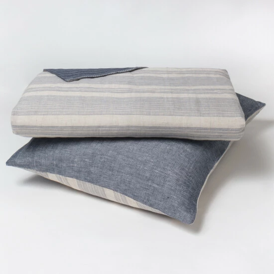 This versitle sham has a subtle Herringbone patterned cotton/linen front, natural linen with blue stripes.Β