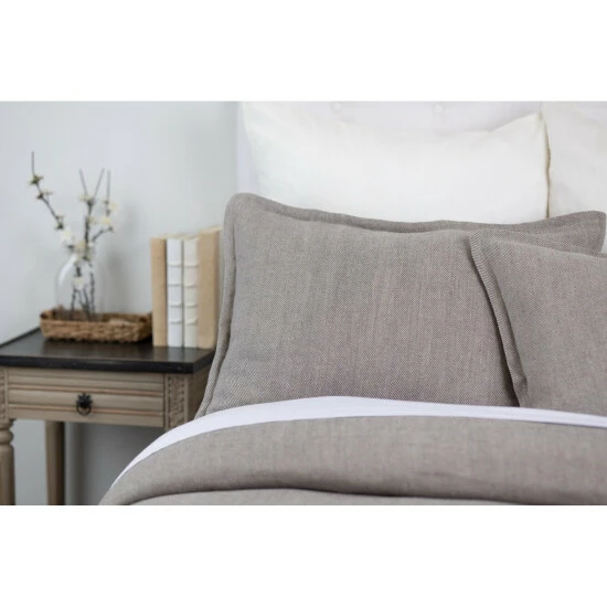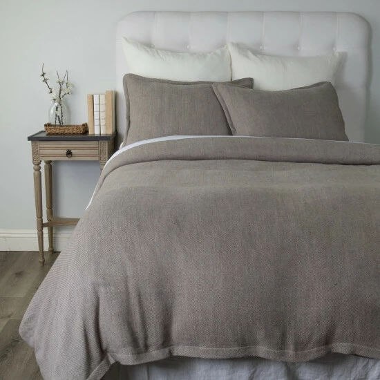 Soft spoken herringbone pattern in taupe make the stone washed Iven Linen Coverlet a necessity for comfort.