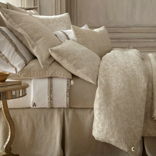 Fine linen and cotton are woven together in a classic damask pattern. Using both plain and sateen weave styles to create a dynamic finish, this pattern can be dressed up or down based on setting and companion pieces selected. Queen Set includes 2 Standard Shams, King Set includes 2 King Shams.