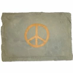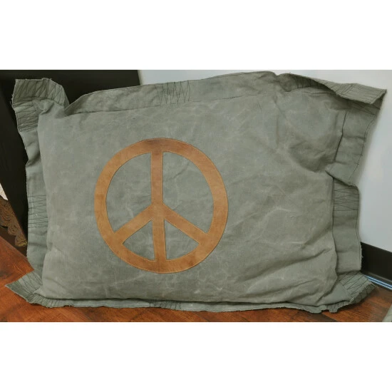 Made in India, the Peace Floor Cushion brings a unique khaki green and tan design into the living room. With a knife edge, the surface is a smooth recycled canvas and cotton blend while the inside is soft polyester.