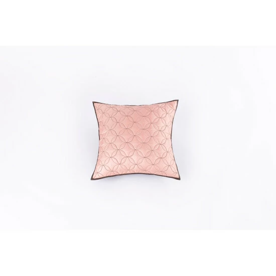 This pillow features a unique abstract geometric blend for a pattern that will draw a curious eye. The pattern is on a light pink base while the border is a solid brown color.