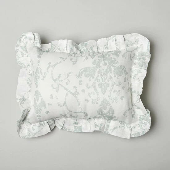 Β A soft damask pattern is printed over an ivory base on this pillow cover, while ruffled edge creates a dreamy look. Made of a cotton/linen blend, this quilt is machine was able for easy care.Β