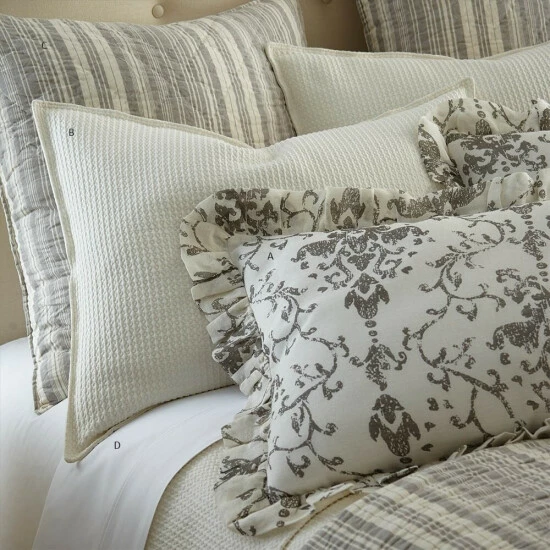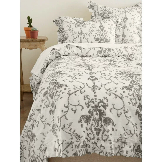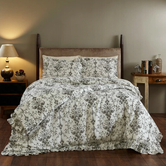 Enjoy this floral grey duvet cover set with ruffled edges. Made from 55% linen and 45% cotton. This complete duvet cover set comes with the whole deal 2 standard shams or 2 king shams for a pretty reasonable price. Machine washable, gentle cycle (cold), tumble dry low or line dry, & no bleach. Queen duvet cover is 88 inches in width x 96 inches in length. King duvet cover is 107 inches in width x 96 inches in length. Standard sham is 20 x 26 inches long and king sham is 20 x 36 inches long.
