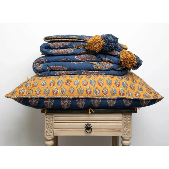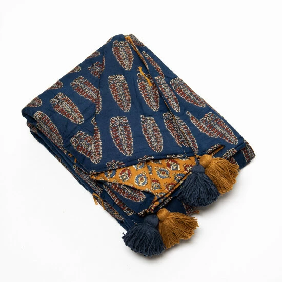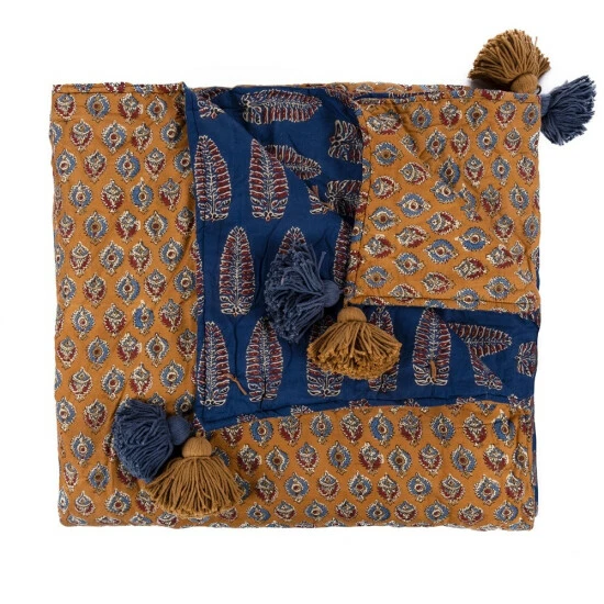 Β Our Cotton Modal Riam Indigo color with block printing on super soft fabric with a retro nod. Pair of tassels on each corer. Paisleys and vintage florals in deep shades of red, blue, and gold work together to create the look. Two dramatic Jaipuri block print patterns are set opposite one another, hand tacked and finished with a pair of hand-tied tassels in each corner, resulting in a vibe that looks as if it has been collected on a recent global adventure.Β