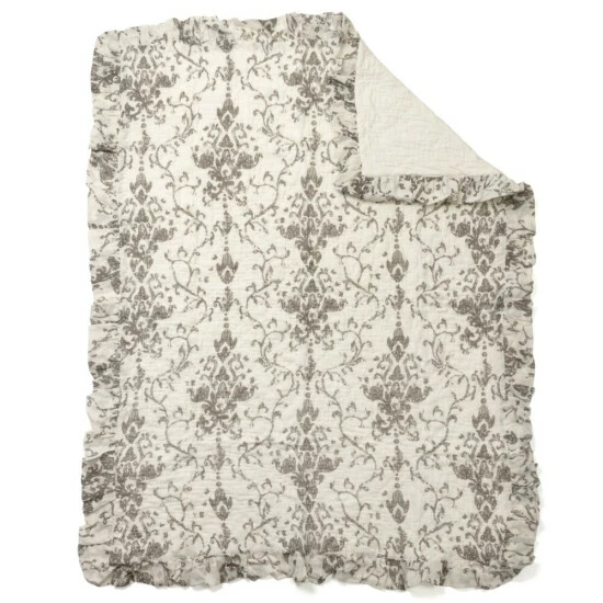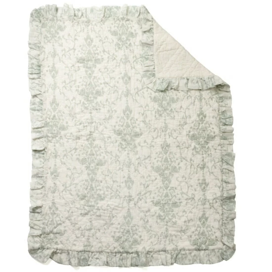 A soft damask pattern is printed over an ivory base on this charming toddler quilt, while ruffled edge creates a dreamy look. Made of a cotton/linen blend, this quilt is machine was able for easy care. Β Available in Seaglass or Grey Print. Β Quilt Measures 36 x 50 Inches.
