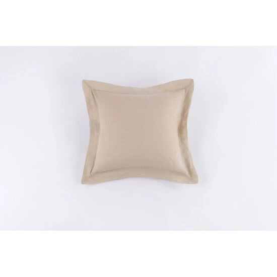 This throw pillow is a tan or brown solid color with noticeable flanges. Material: 100% CottonSize: 16 x 16 inchesRemovable cover and includes a polyester insertCare Instructions: Machine Wash Cold, No Bleach. Gentle Cycle. Tumble Dry Low or Flat or Line Dry. Do not Dry Clean