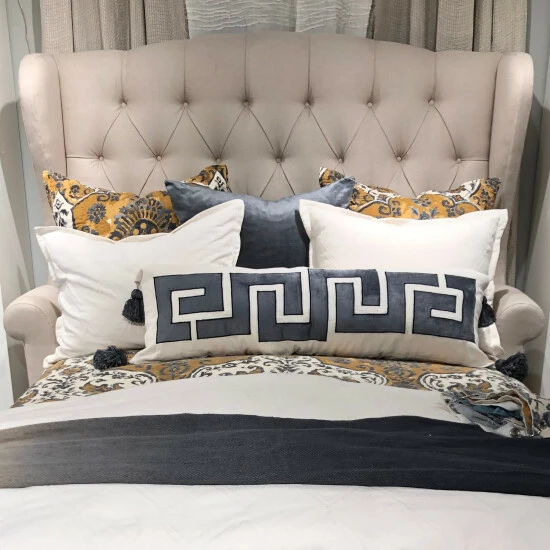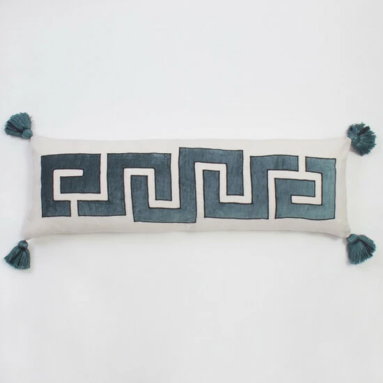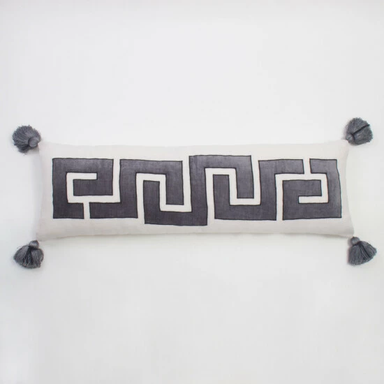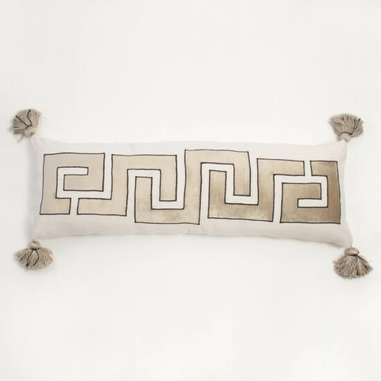 Β The Taten Extra Long Bolster Pillow a natural linen base, with a velvet Greek Key design applique, and corners with tassels for rich, luxurious texture. Comes as removable cover and polyfill insert.Β
