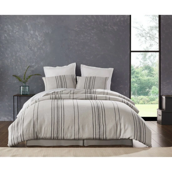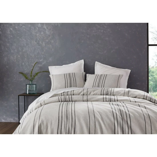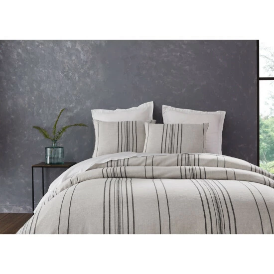 Varne Duvet with yarn dyed woven stripes. Charcoal set against natural color giving this duvet a causal sophistication that can transcend a wide variety of styles.